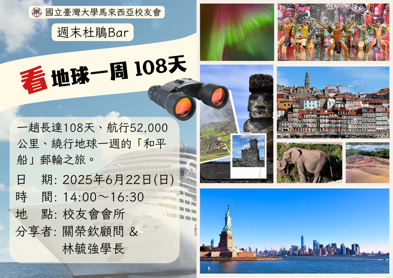 我們誠摯邀請您於6月22日(星期日)下午2點,蒞臨台大校友會會所,一同參與由顧問關榮欽與校友林毓強聯合主講的分享講座。讓我們一同踏上這段夢想航程的精彩回顧,感受不一樣的世界與心靈之旅,對旅遊有更多的想像和認識。