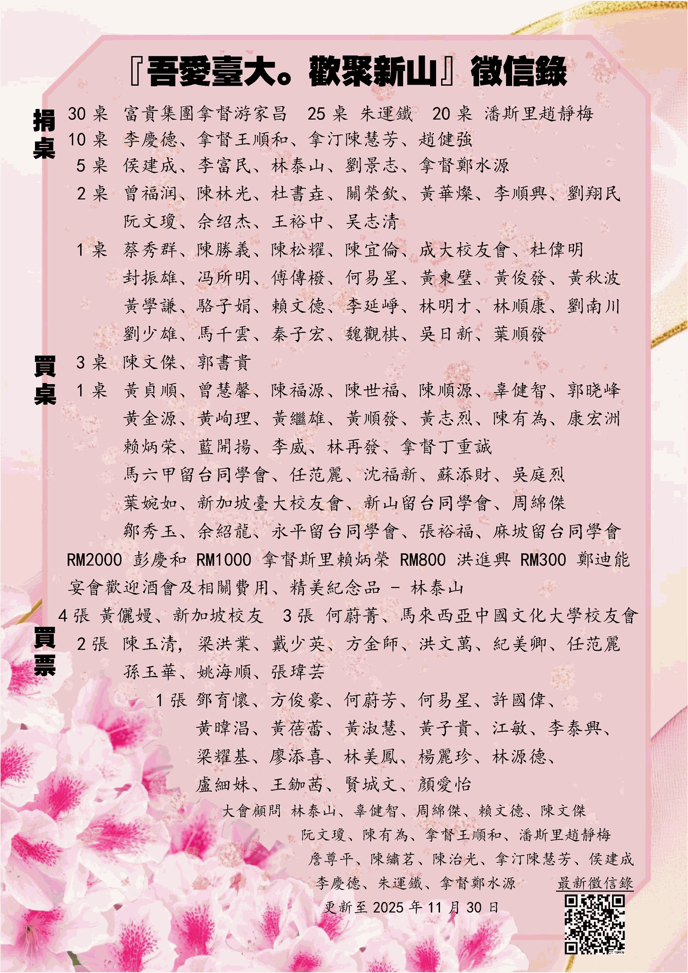 1桌 黃貞順、曾慧馨、陳福源、陳世福、陳順源、辜健智、郭晓峰、黄金源、黄峋理、黃繼雄、黃順發、黃志烈、陳有為、康宏洲、藍開揚、李威、林再發、拿督丁重誠、馬六甲留台同學會、任范麗、沈福新、蘇添財、吳庭烈、葉婉如、新加坡臺大校友會、新山留台同學會、周綿傑、馬來西亞中國文化大學校友會、 鄒秀玉、余紹龍、永平留台同學會、張裕福、麻坡留台同學會